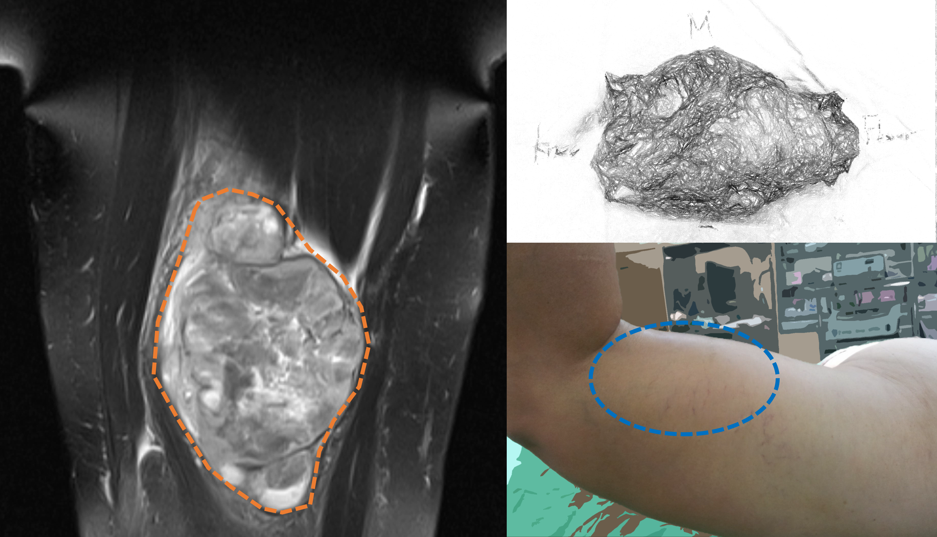 左圖為當懷疑軟組織肉瘤時常會安排的核磁共振影像,經判斷為平滑肌肉瘤後,安排完整的腫瘤切除手術(右圖)